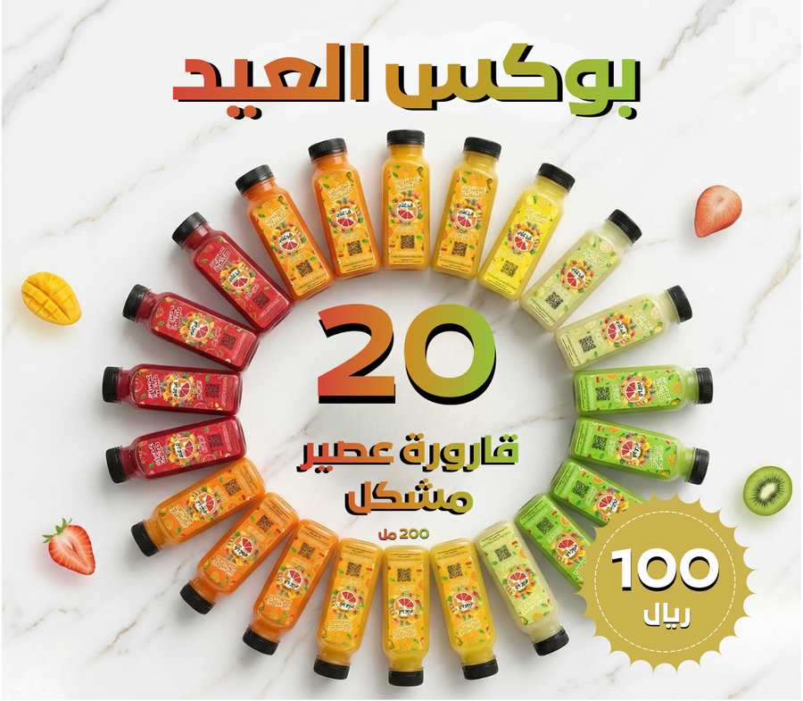 كمل فرحة العيد بلمة الحبايب مع انفجار من النكهات المنعشة! بوكس العيد من "ميجا فرغلي" هو الخيار الأرقى لضيافتك؛ 20 قارورة عصير طبيعي طازج بـ 20 نكهة مختلفة ترضي وتنعش كل الأذواق.